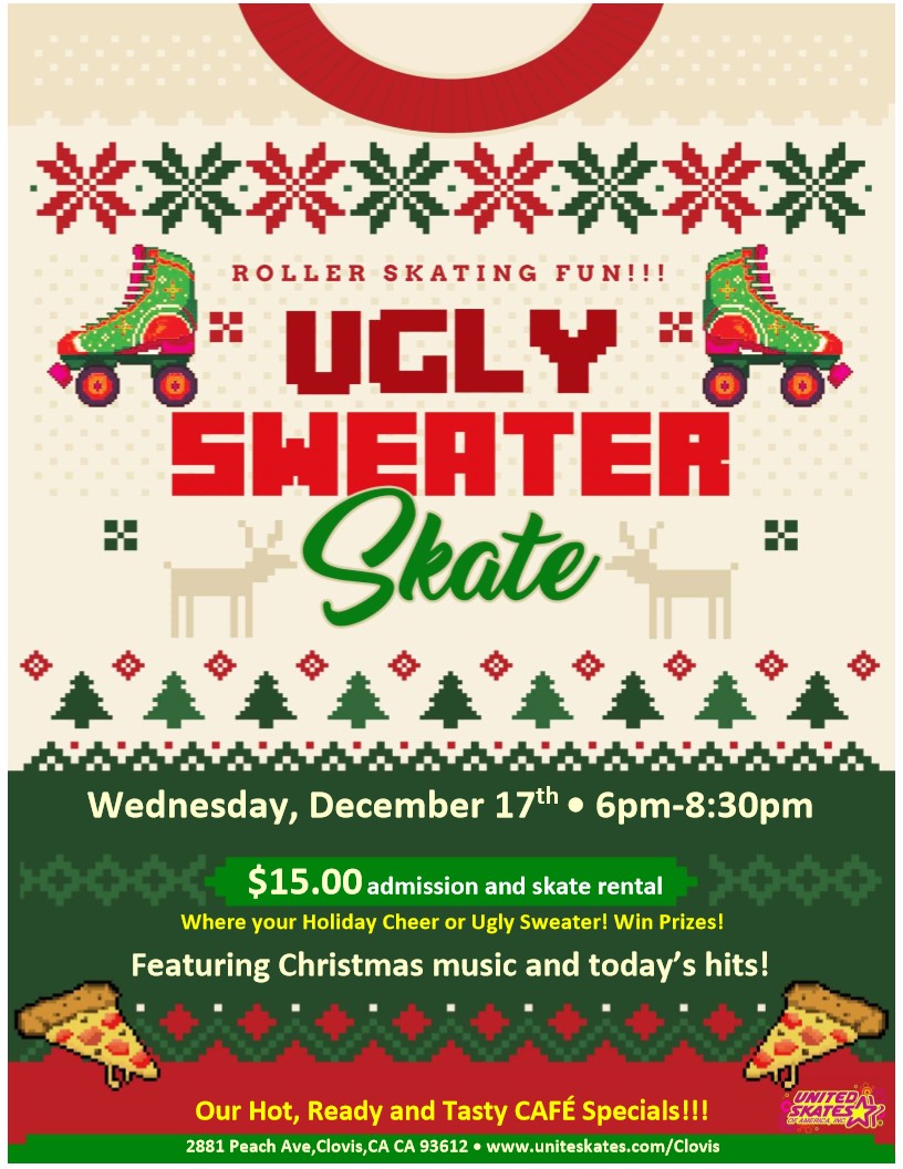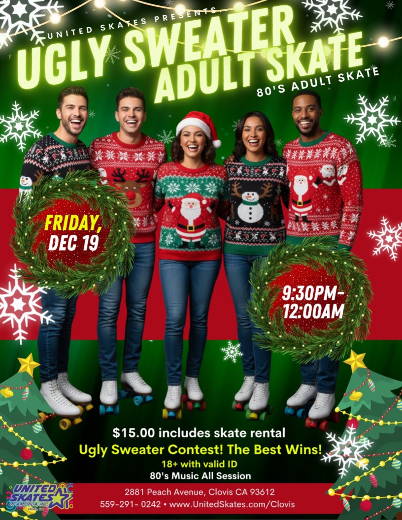 🎄🛼 UGLY SWEATER SKATE NIGHT! 🛼🎄 Get ready to roll into the holiday spirit at United Skates of America in Clovis! 📅 Wednesday, December 17th 🕕 6:00 PM – 8:30 PM 🎟️ $15 Admission + Skate Rental Wear your wildest, wackiest, most wonderful Ugly Sweater or show off your Holiday Cheer—we’re giving away PRIZES for […]