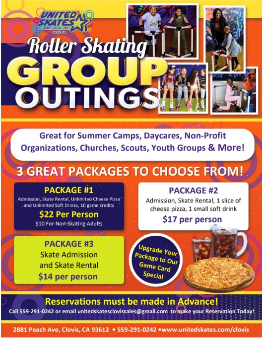 Get amazing group rates for camps, day cares, youth clubs, church groups, after school programs, parks and recreation programs, and more! Schedule a day out and get great discounted group rates and an all-inclusive experience. Advance booking for groups required. Call 559-291-0242 or email us at unitedskatesclovissales@gmail.com
