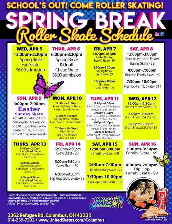 Spring Break Roller Skating is Wednesday April 5th 2023 through Sunday, April 16th 2023.