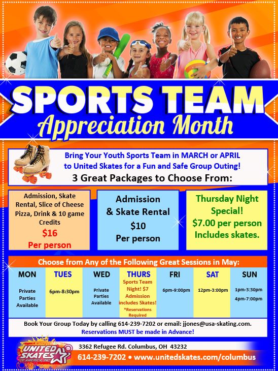 Celebrate your beginning or end of the Sports Season at United Skates!! Great Group Discounted Skating! Possible Private event skating with groups 50+ Pick a date and Group rate Price anytime between March 1st - April 30th!! CLICK HERE FOR MORE INFORMATION & SIGN-UP!!