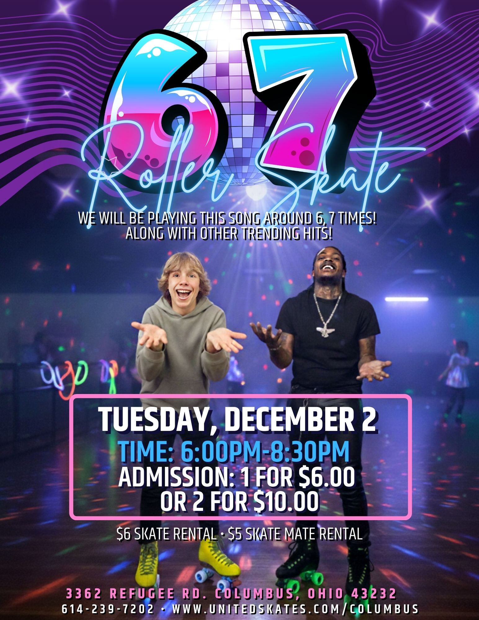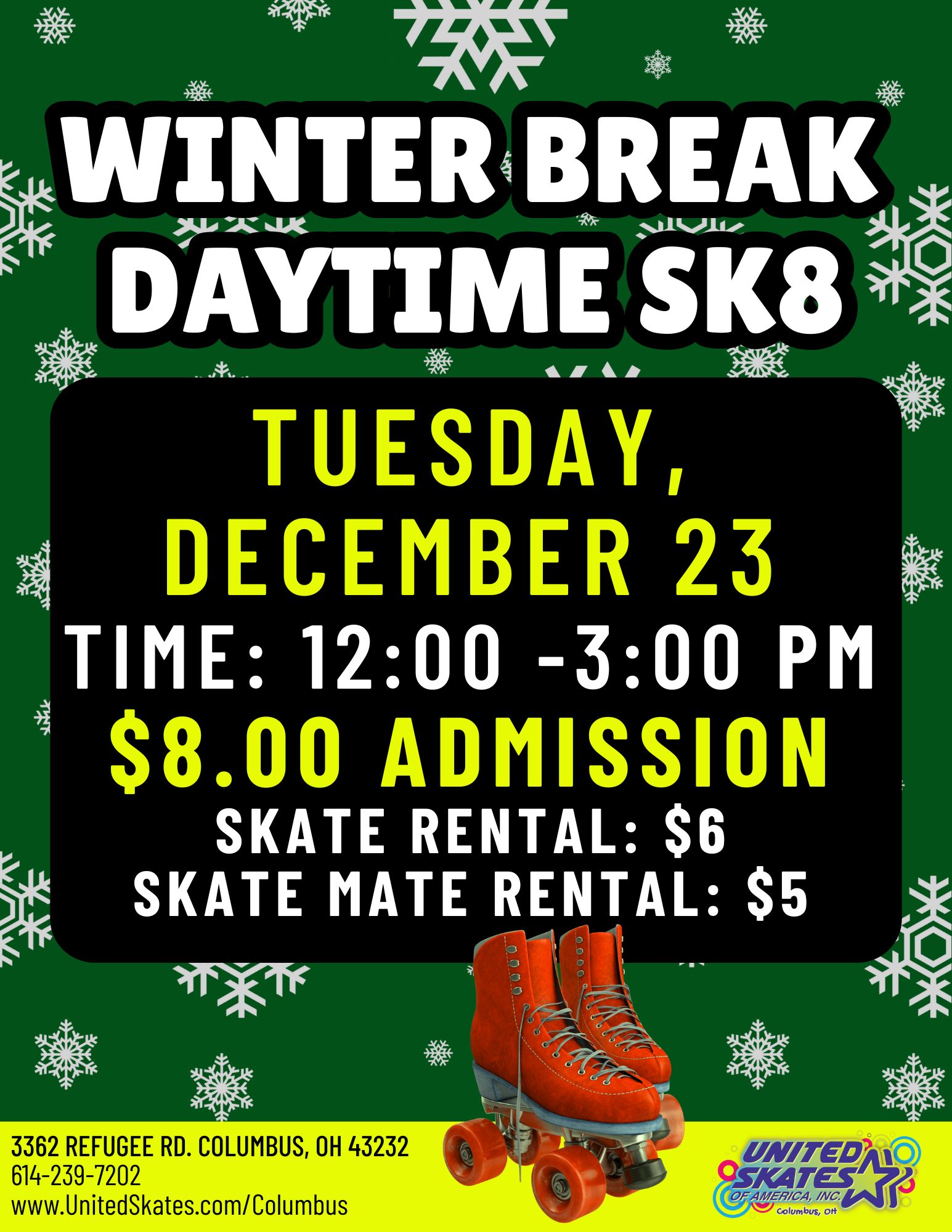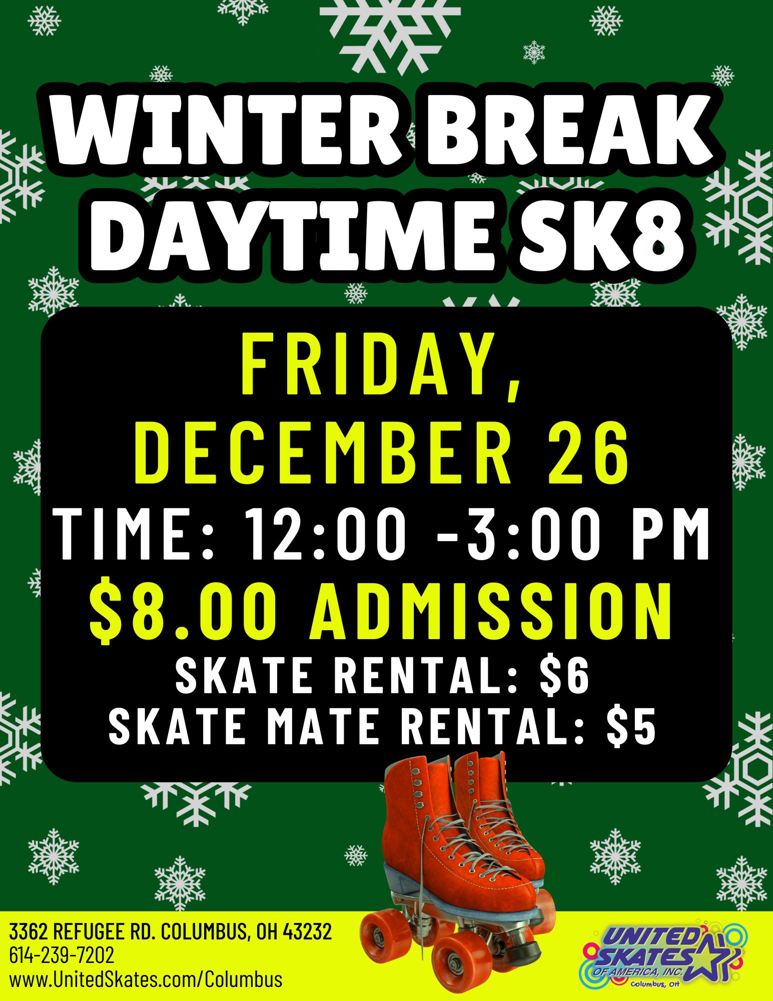 🎉 Daytime and Evening Private Events 🎉 🛼 School Parties, Fundraisers, Birthday Parties & MORE! 📞 Contact Us for Availability: 614-239-7202 ⭐ Reservations Required ⭐ 📚 SCHOOL STEM OR FUN FIELD TRIPS (Min 75 Guests) 🏢 CORPORATE EVENTS 🧍♂️ ALL SKATERS (Adults & Parents of Children) must sign a 📝 Liability Waiver ⏰ All sessions start and end at posted times – No stayovers