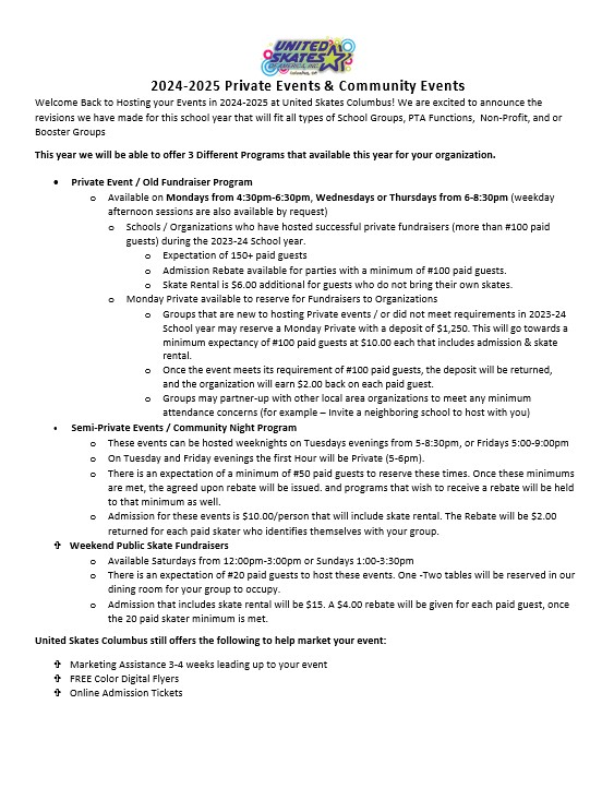 Raise funds for your school, group, or church while you skate! We’ll provide all the marketing pieces so all you have to do is spread the word and show up. Choose from one of our packages below and contact us to get your fundraiser set up. We do all the work and you have all the fun!