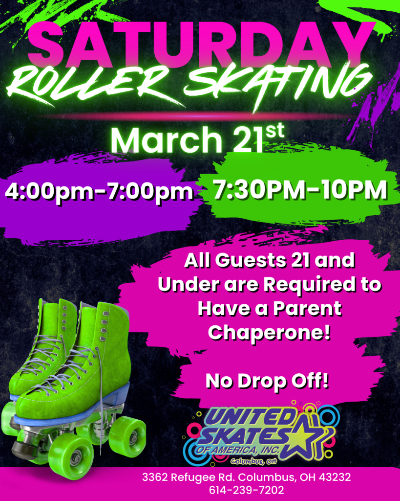 All guests age 21 and under must be accompanied by a parent or adult chaperone during our roller skating sessions. No drop-offs will be permitted.