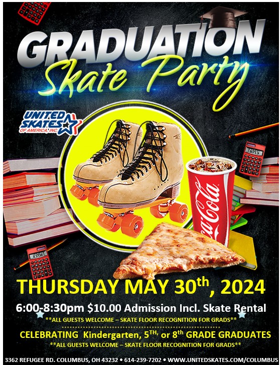 United Skates Of America Columbus 3362 Refugee Rd, Columbus, OHThursday May 30th 6:00-8:30pm $10 Admission includes Skate Rental *5th, 8th & 12th Grade Graduates will be celebrated!! All guests ages 3-17 Must pay admission & skate rental (or bring their own). Non-Skating Adults may enter at no charge All Adult skaters 18+ are required to fill out our Liability Waiver - Now available online. […]