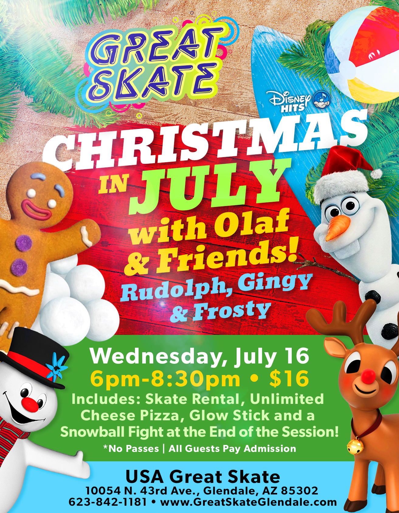 Cool down this summer with a magical mid-year holiday celebration at Great Skate Glendale! Join us Wednesday, July 16 from 6β8:30 PM for a frosty evening of festive fun starring Olaf, Rudolph, Gingy, and Frosty!