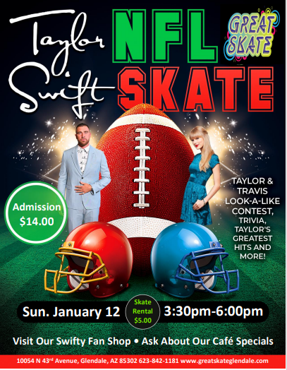 Get ready for the ultimate Taylor Swift and NFL mashup! π Join us on Sunday, January 12 for a fun-filled skating afternoon featuring all of Taylor Swiftβs greatest hits and NFL excitement. Whether youβre a football fan or a Swiftie, this event is for you! π