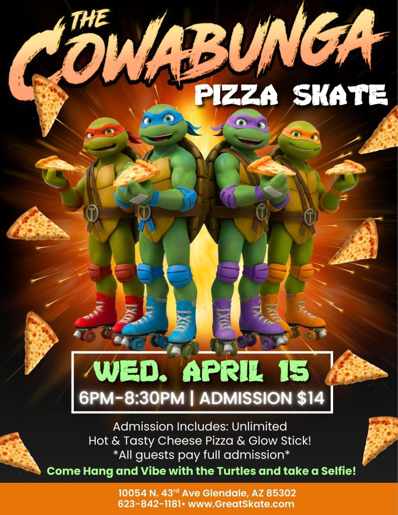 Lean, green, and on the scene! Join us for a TMNT Roller Disco at Great Skate. We’ve got the tunes, the pizza, and the green glow lights—you just bring the moves.
