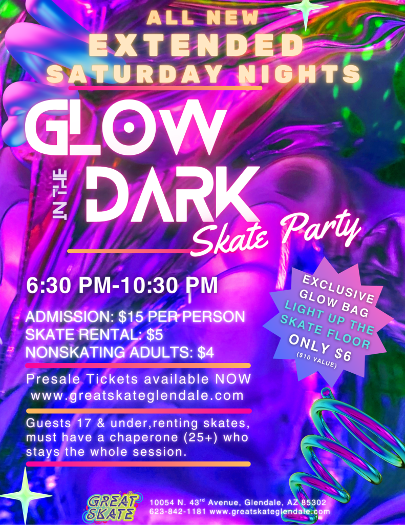 Ready to light up your weekend? Great Skate Glendale is turning up the neon every Saturday night with our Glow in the Dark Skate Party—a dazzling experience for all ages! Let’s Level Up and Glow up this session! Dress in your best Neon attire!