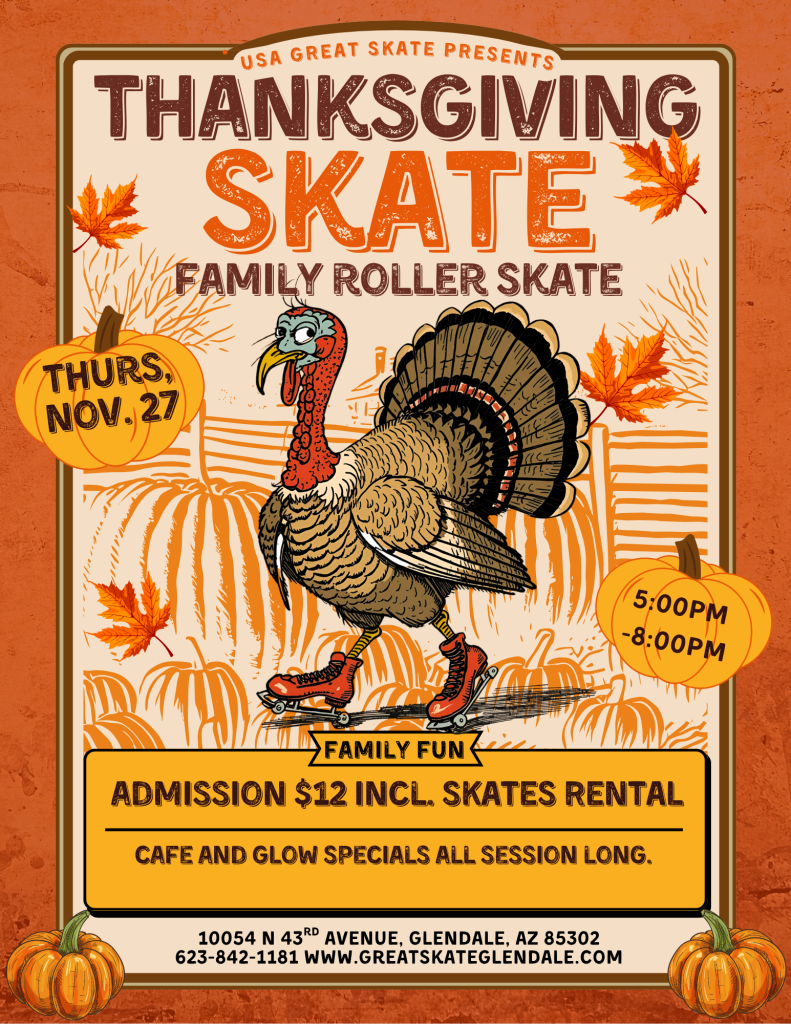 Come and skate with our fun, roller-skating turkey mascot! We’ll be offering Cafe and Glow Specials all session long. Whether you’re a seasoned skater or a beginner, this is a fantastic event for all ages and skill levels.