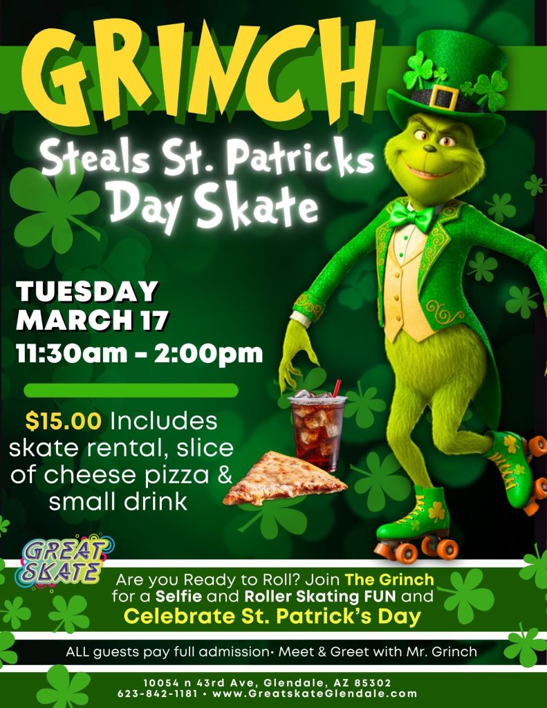 He’s mean, he’s green, and he’s definitely not Irish… but The Grinch is crashing our St. Patrick’s Day party! Prepare for a roller skating event where emerald isle charm meets Whoville mischief. We’re trading hearts that are “two sizes too small” for spirits that are “two leaps too high” as we blend festive cheer with a dash of cynical fun.