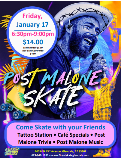 - Enjoy Post Malone’s biggest hits played throughout the evening as you skate with friends.