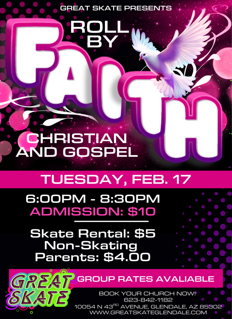 Join us at Great Skate for Roll By Faith, a night dedicated to Christian and Gospel music. Bring your youth group, your family, or just yourself for an evening of fellowship and fun!