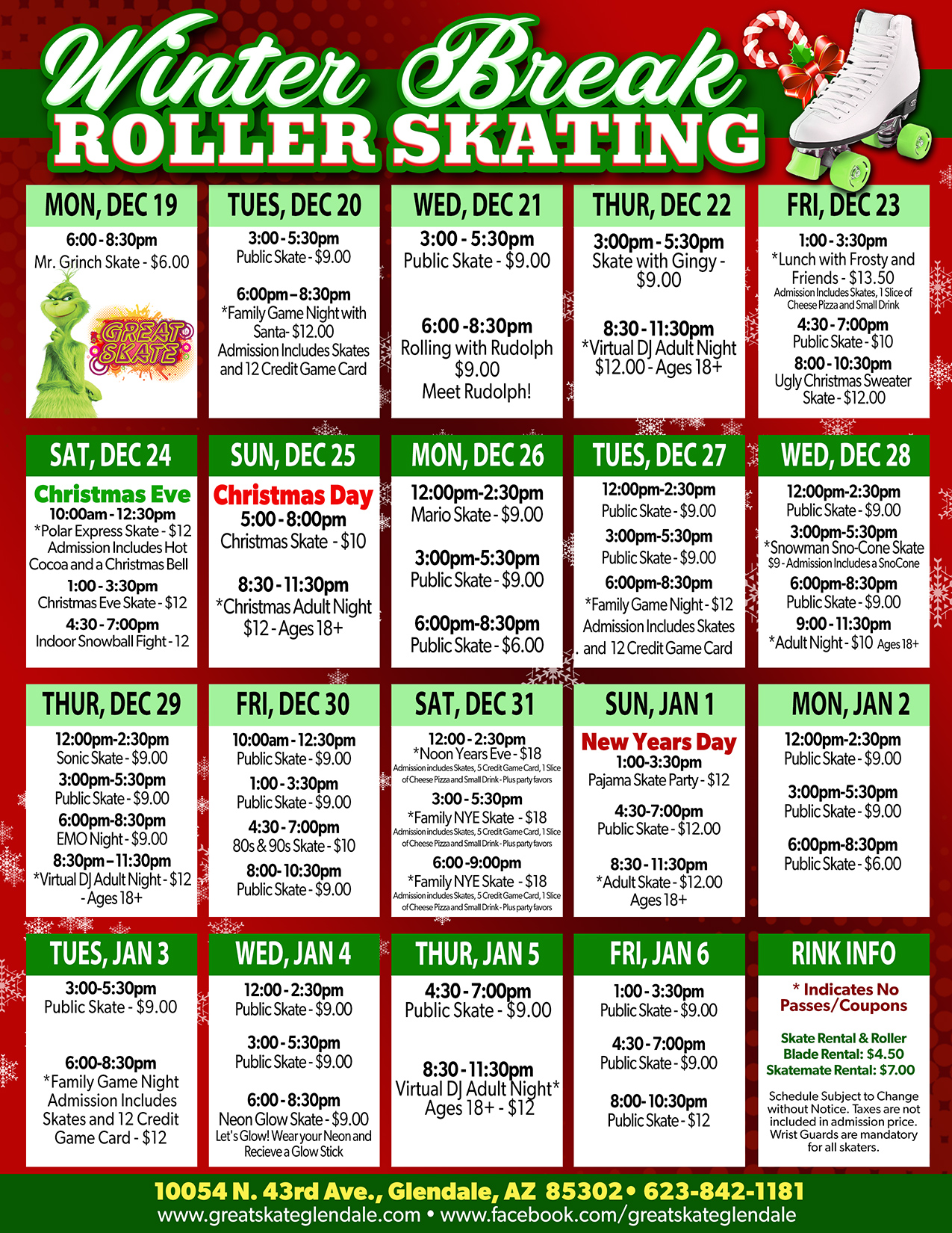 Winter Break Roller Skating is Monday, December 19th 2022 through Sunday, January 8th 2023.