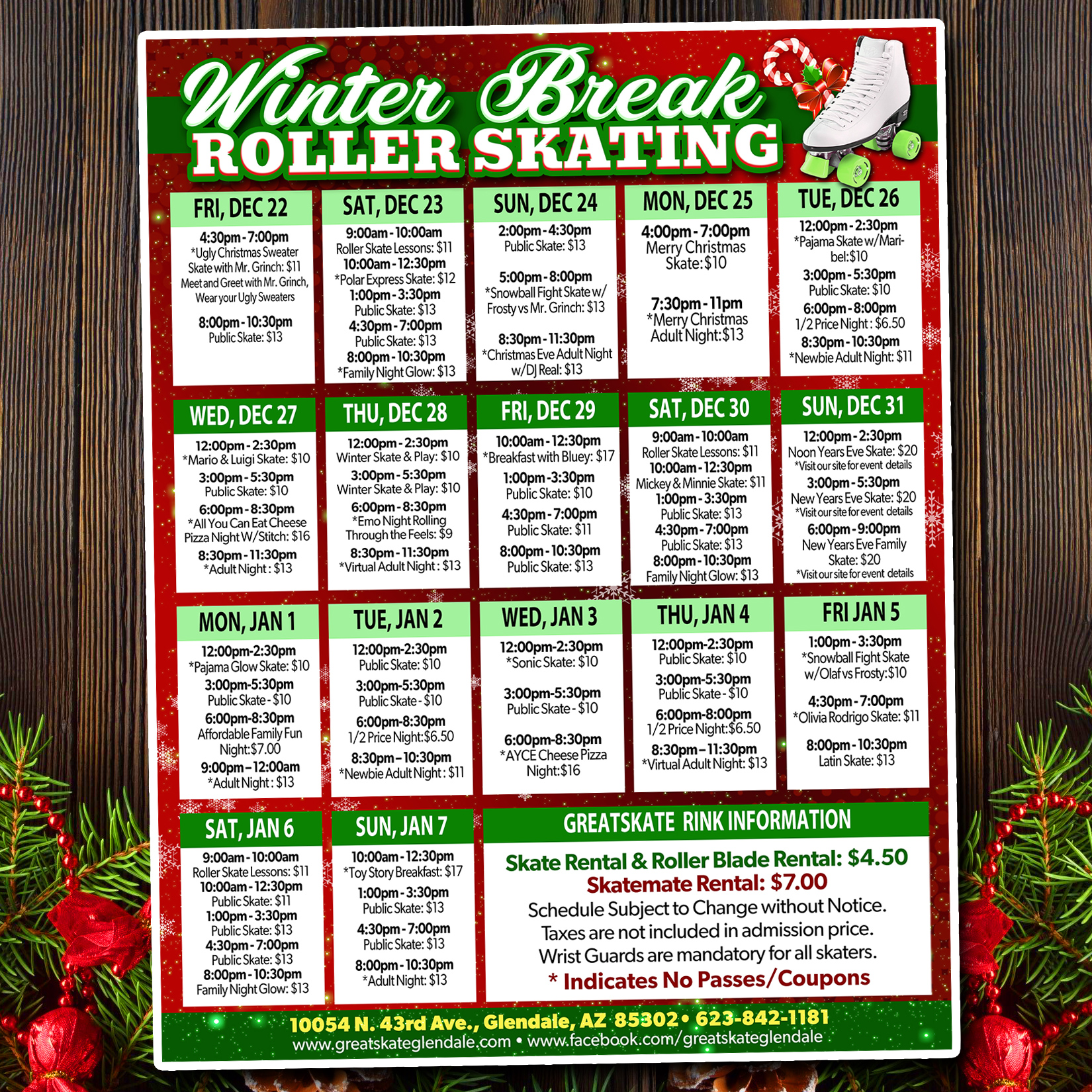 We are featuring events with Characters, Glow Skates, NYE Events, Grinch Skates, Adults Skates and so much more..
