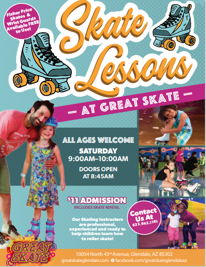 Great Skate 10054 N. 43rd Ave, Glendale, AZ, United StatesCome learn to skate with us. Admission: $11.00 includes rentals Doors open at 8:30 and close at 9:05 early arrival is suggested. Wrist guards are required, and are available at the skate counter