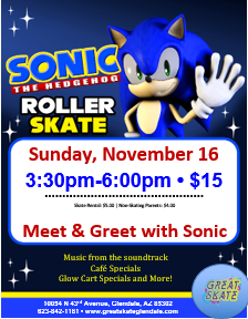 Join us as we welcome Sonic here for a meet and greet on Sunday, November 16! 3:30pm - 6:00pm Admission: $15.00 Skate Rental: $5.00 Non-Skating Parents: $4.00 Dress up as your favorite character!