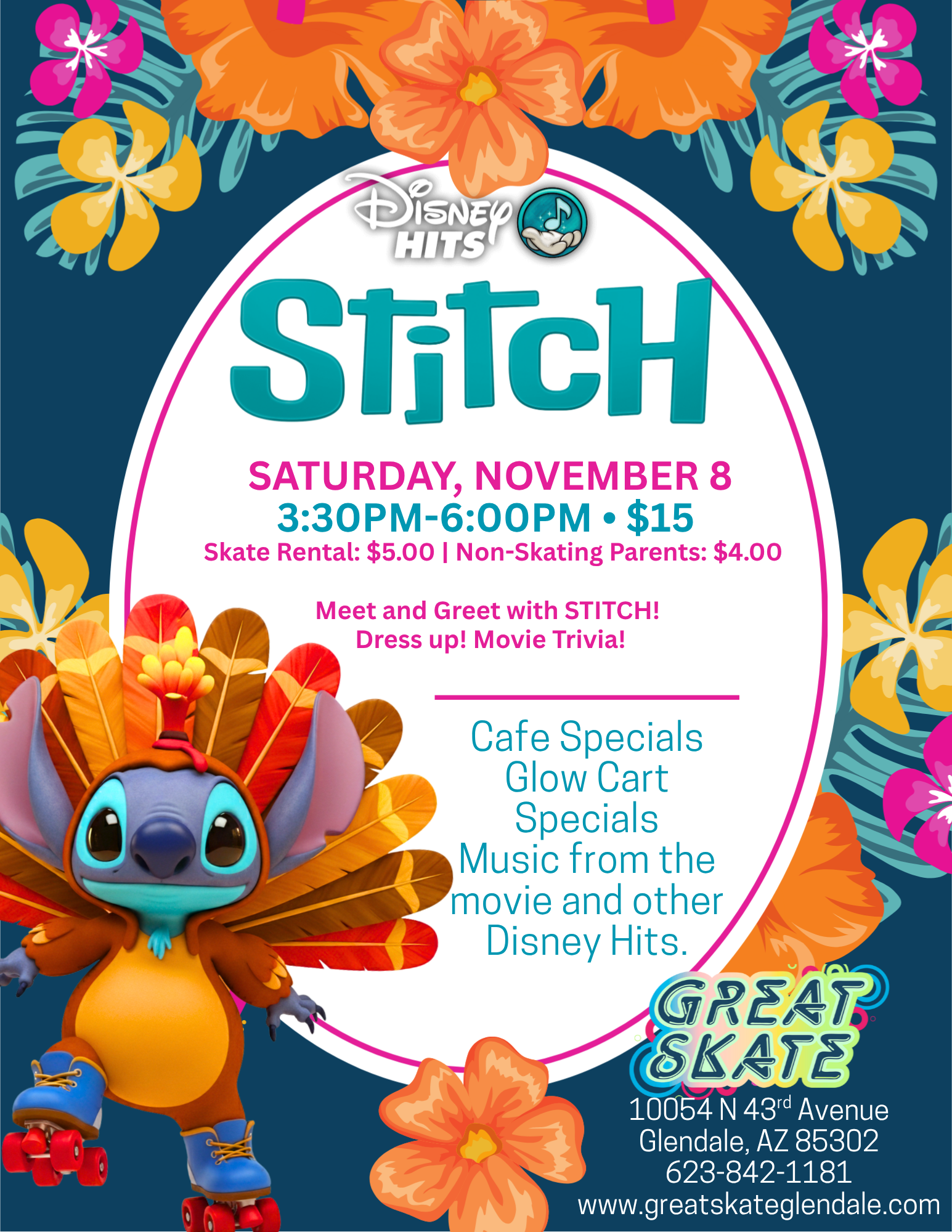 Stitch's Disney Hits Skate Party! 💙🌺 Ohana means family, and family means nobody gets left behind... especially for a skate party! Join us at Great Skate on Saturday, November 8th for an out-of-this-world afternoon with everyone's favorite alien, Stitch! Put on your best tropical gear, grab your skates, and get ready for a fun-filled session […]