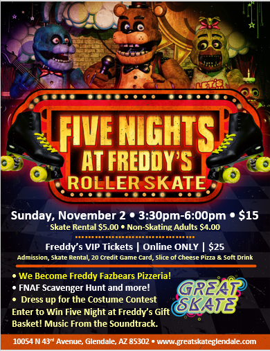 Come down the Freddy FazBear Pizzeria on Sunday, November 2, 2025 3:30pm - 6:00pm Admission: $15.00 | Skate Rental: $5.00 | Non-Skating Parents: $4.00 VIP Ticket Online ONLY: $25.00 includes Admission, Skate Rental, 20 Credit Game Card, One Slice of Cheese Pizza and a Small Drink. Meet and Greet with Freddy FazBear!