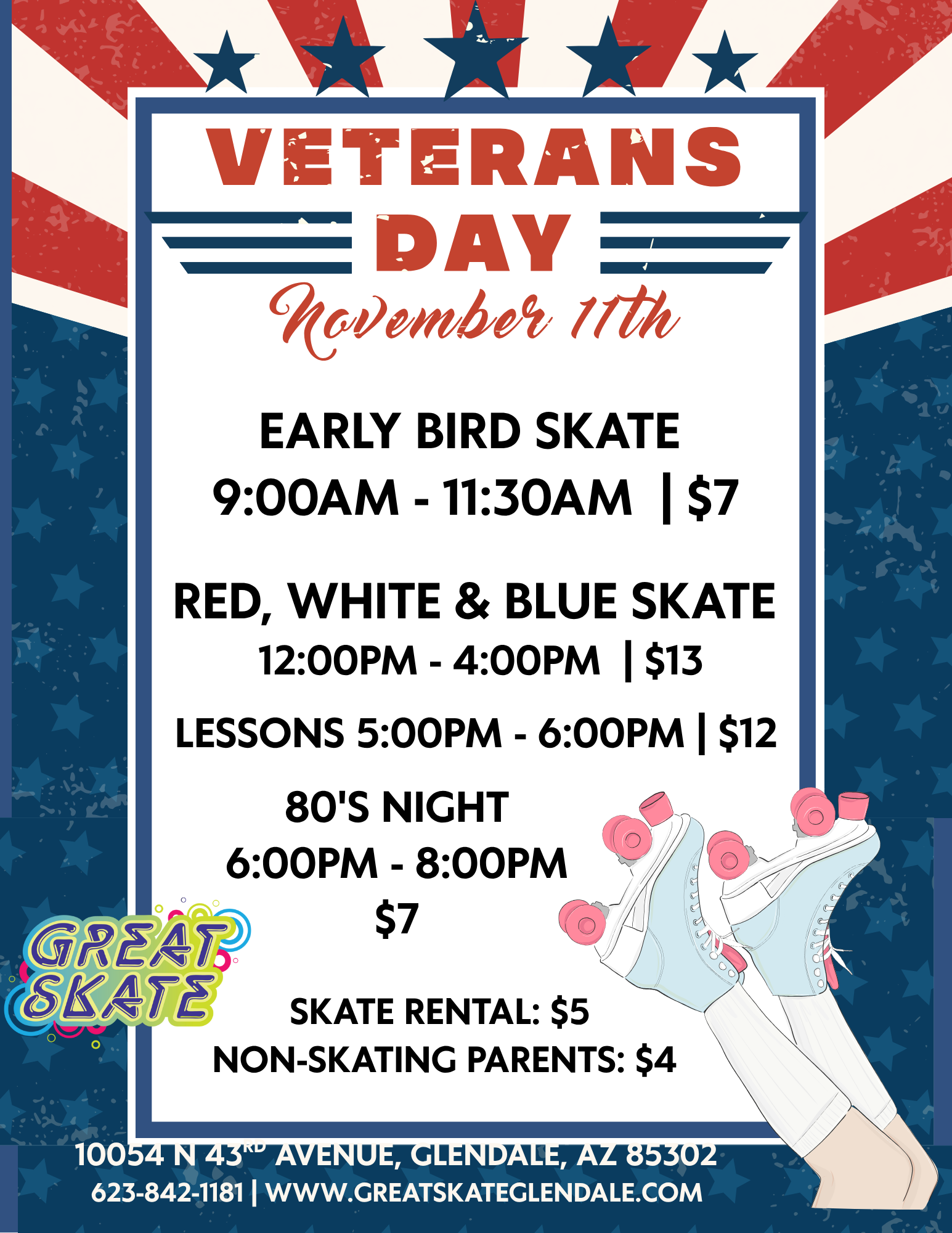 Join this special day as we honor our Veterans! Early Bird Skate 9:00am - 11:30am | $7.00* Extended Skate 12:00pm-4:00pm | $13.00* Learn to Skate Program 5:00pm - 6:00pm | $12.00* includes Skate Rental 80's Skate | Come Skate to the BEST of the 1980's 6:00pm - 8:00pm | $7.00* Newbie Adult Night 8:30pm - […]