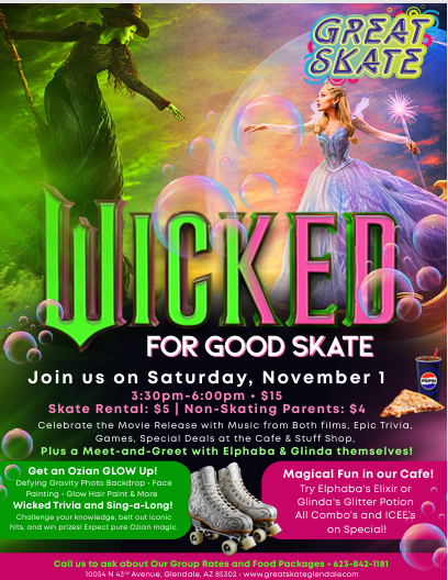 WICKED FOR GOOD SKATE! Ozians, grab your skates! 💚💖 Join us for the Wicked for Good Skate on Saturday, November 1 to celebrate the movie release! It's going to be wonderfully WICKED! What to Expect: Time: 3:30 PM–6:00 PM Price: $15 Admission ($5 Skate Rental) Music from both Wicked films Epic Wicked Trivia & a […]