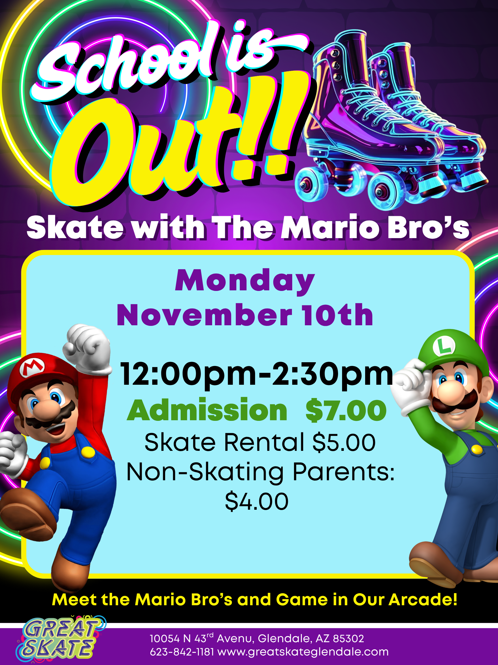 School is Out! Skate with The Mario Bros! Come skate with Mario and Luigi at Great Skate Glendale! When: Monday, November 10th Time: 12:00 pm - 2:30 pm Meet the Mario Bros and enjoy the fun, arcade games, and great music! Admission: $7.00* Skate Rental: $5.00 Non-Skating Parents: $4.00 No Passes