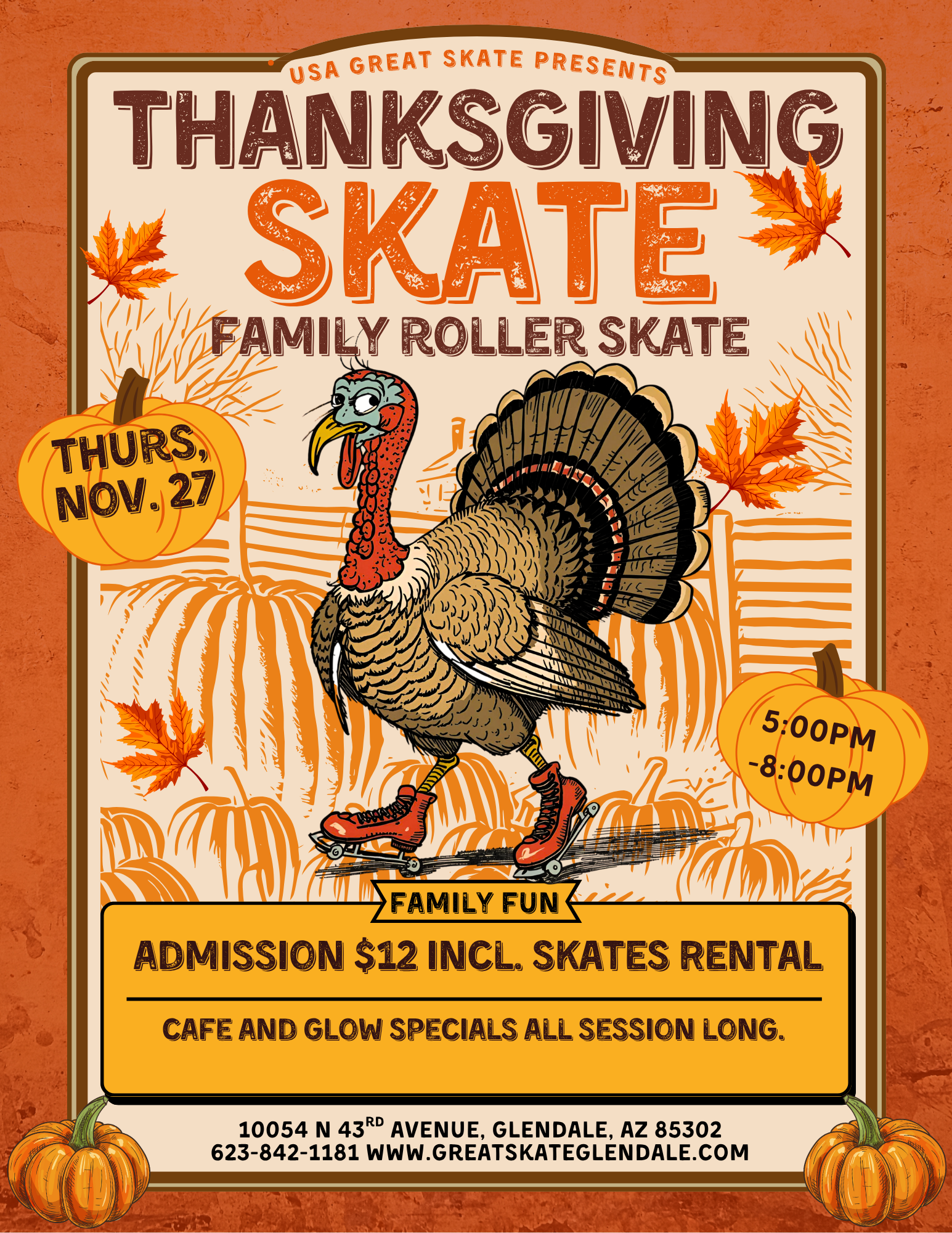 Looking for a unique way to celebrate the holiday and get moving? Join us for the annual USA Great Skate Thanksgiving Family Roller Skate! It's the perfect an after-dinner activity to enjoy some family fun and make great memories. When: Thursday, November 27th Time: 5:00 PM - 8:00 PM Where: 10054 N 43rd Avenue, […]