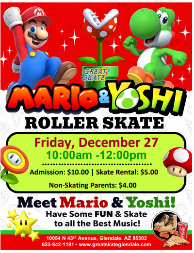Meet and greet with Mario, Yoshi & Luigi. Friday, December 27 | 🕛 Session 1: 10:00 AM - 12:00 PM Admission: $10.00 Skate Rental: $5.00 Non-Skating Parents: $4.00
