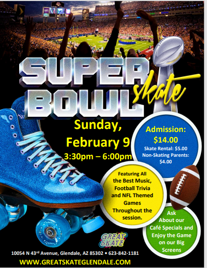 Join us this Super Bowl Sunday, February 9, 2025 3:30pm - 6:00pm Admission: $14.00 | Skate Rental: $5.00 | Non-Skating parents: $5.00 Wear your favorite Football appeal. Cafe specials all […]