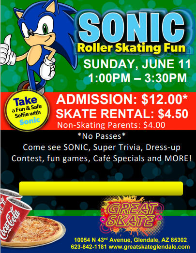 Come meet SONIC Admission: $12.00* Skate Rental: $4.50 Non-Skating Parents: $4.00 *No Passes* Dress up as Sonic or your favorite character, trivia, music from the game/soundtrack and more.