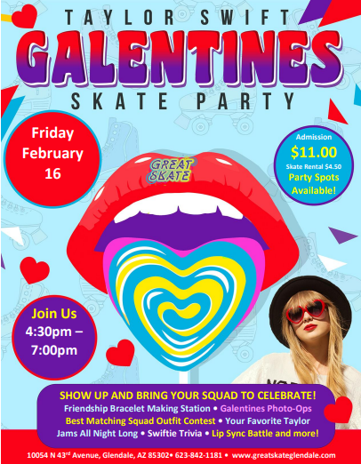 Friday, February 16 4:30pm - 7:00pm Admission: $11.00 Skate Rental: $4.50 Non-Skating Parents: $4.00 Taylor Swift Music Friendship Bracelet stations making and trading friendship bracelets. Photo station with Taylor Swift Backdrop Dress up in your best era