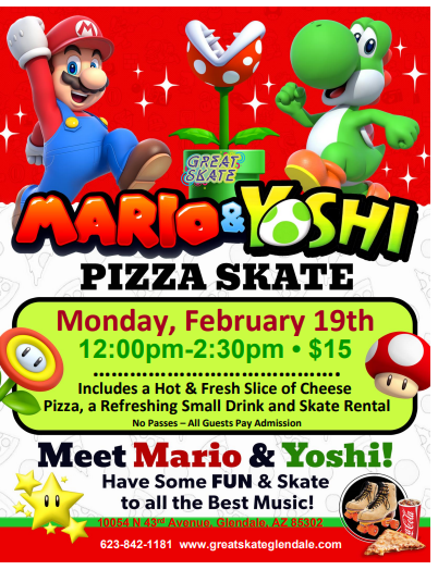 Monday, February 19, 2023 12:00pm - 2:30pm Admission: $15.00 includes skate rental, One Slice of Cheese Pizza and a Small Drink *No Passes/All Guests Pay Admission* Meet and Greets with Mario and Yoshi