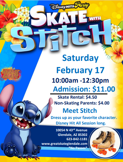 Saturday, February 17, 2024 10:00am -12:30pm Admission: $11.00 Skate Rental: $4.50 Non-Skating Parents: $4.00 Meet and Greet with Stitch No Passes