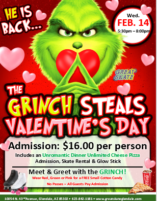 Wednesday, Feb. 14, 2024 5:30pm - 8:00pm Admission: $16.00 includes Skate Rental, Unlimited Cheese Pizza and a Glow Stick *No Passes/All Guests Pay Admission Meet and Greet with MR. Grinch Show your love an wear Red, Green or Pink for a FREE Small Cotton Candy!