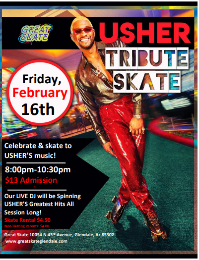 Come skate to the best of Usher! Friday, Feb. 16 8:00pm - 10:30pm Admission: $13.00 Skate Rental: $4.50 Non-Skating Parents: $4.00 Usher songs all session long.