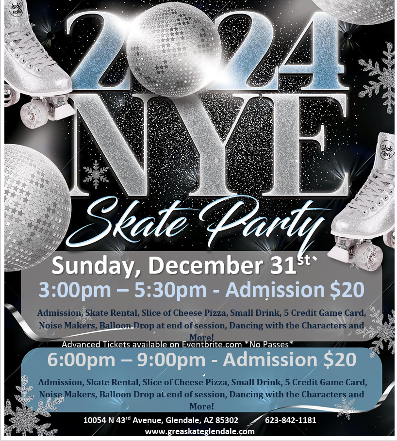 2024 New Year's Eve Skate Join us for an exciting in-person event, the 2024 NEW Year's Eve Skate! Get ready to have a blast at Great Skate, located at 10054 North 43rd Avenue, Glendale, AZ, USA. Sunday, December 31, 2023 6:00pm -9:00pm Bring your friends and family to celebrate the New Year in style. Lace up […]