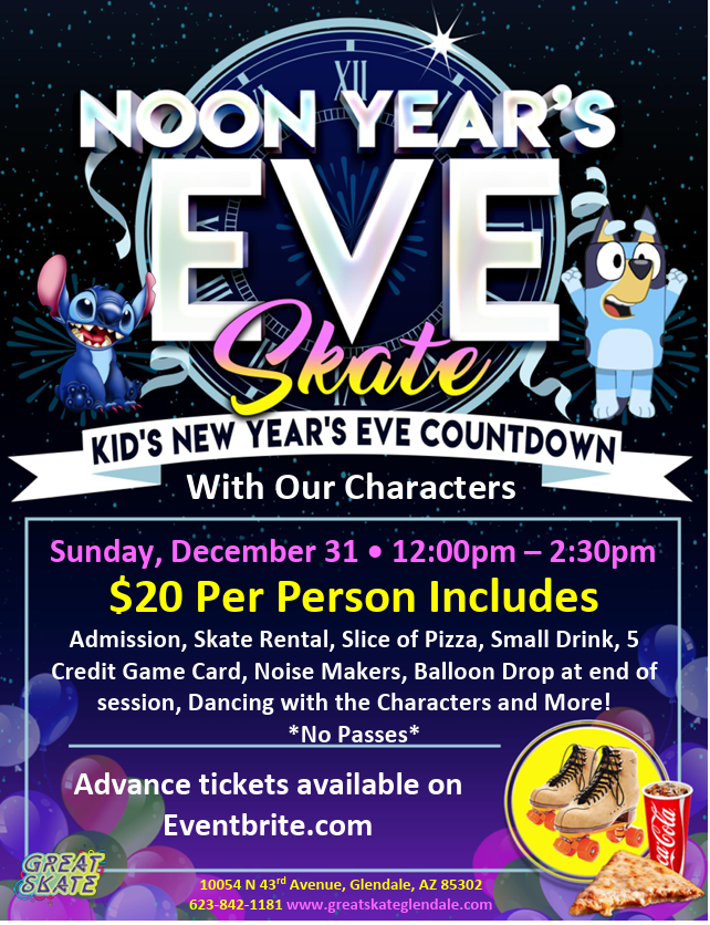 Noon Year's Eve Skate Join us for an exciting in-person event, the Noon Year's Eve Skate! Get ready to have a blast at Great Skate, located at 10054 North 43rd Avenue, Glendale, AZ, USA. Sunday, December 31, 2023 12:00pm - 2:30pm Bring your friends and family to celebrate the New Year in style. Lace up […]