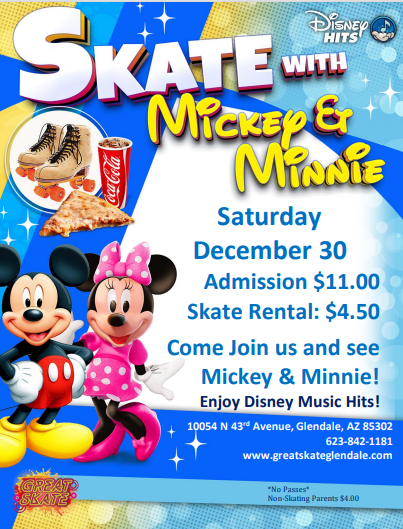 Saturday, December 30 10:00am - 12:30pm Admission; $11.00* Skate Rental: $4.50 Non-Skating Parents: $4.00 *No Passes* Meet and greet with Mickey & Minnie Mouse.