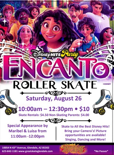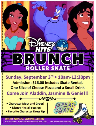 Sunday, September 3, 2023 10:00am - 12:30pm Admission: $16.00 includes skate rental, one slice of cheese pizza and a small drink *No Passes/All guests pay admission* Meet and Greets with Aladdin, Jasmine and Genie Disney Hits all session long