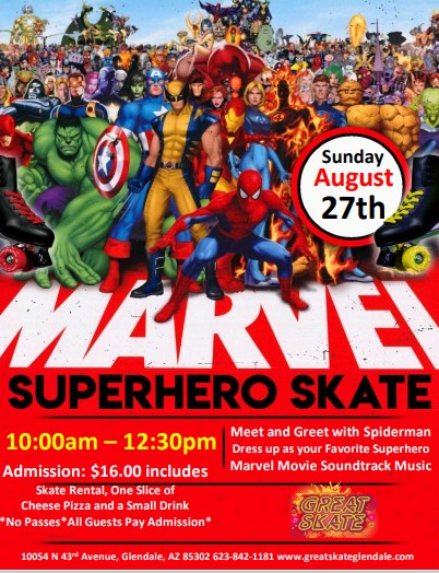 Sunday, August 27, 2023 10:00am -12:30pm Admission: $16.00 includes skate rental, one slice of cheese pizza and a small drink *No Passes/All guests pay admission* Meet and greet with Spiderman Music from Marvel movies Dress up as your favorite superheroes.