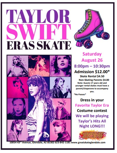 Join us for a great night playing all the best of Taylor Swift. Calling al Swifties! Saturday, August 26 8:00pm -10:30pm Admission: $12.00* Skate Rental: $4.50 Non-Skating Parents: $4.00 Note: Guests Under the age of 17 that are renting skates must have a parent/chaperone to accompany them. *No Passes* Dress up in your best ERA […]