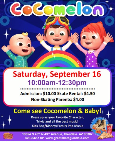 Come see Cocomelon and Baby Saturday, September 16 10:00am - 12:30pm Admission: $10.00* Skate Rental: $4.50 Non-Skating Parents: $4.00 *No Passes* Dress up as your favorite characters.