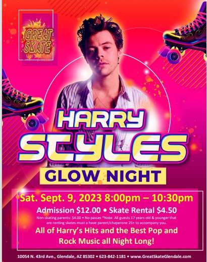 Do you love Harry Styles? We do! Join us for some great music - Harry Styles all session long Saturday, September 9 8:00pm - 10:30pm Admission: $12.00* Skate Rental: $4.50 Non-Skating Parents: $4.00 *No Passes/All guests 17 and younger that are renting skates you must have a parent/Chaperone to accompany you 25+ of older.