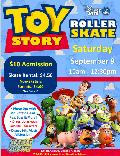 Come see Buzz, Woody, Mr. Potato Head, Rex and an Alien. Saturday, September 9 10:00am - 12:30pm Admission: $10.00* Skate Rental: $4.50 Non-Skating Parents: $4.00 No Passes Dress up as your favorite characters Café Specials Disney Hits all session long.