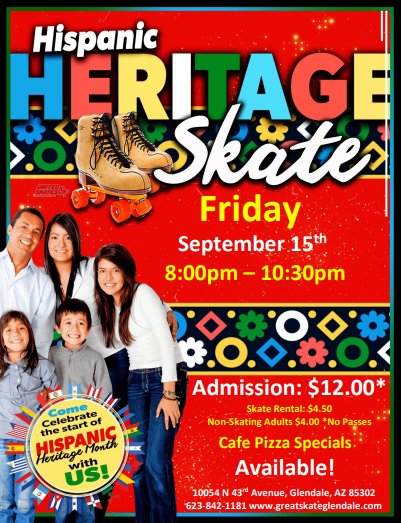 Come celebrate the start of Hispanic Heritage Month with us. We will be playing some of the best Latin music and Top 100 hits all session long. Friday, September 15 8:00pm - 10:30pm Admission: $12.00 Admission and a Skate & Play Game Card: $15.50 Rentals $4.50 *No coupons/passes accepted this session* **Wrist guards are required […]