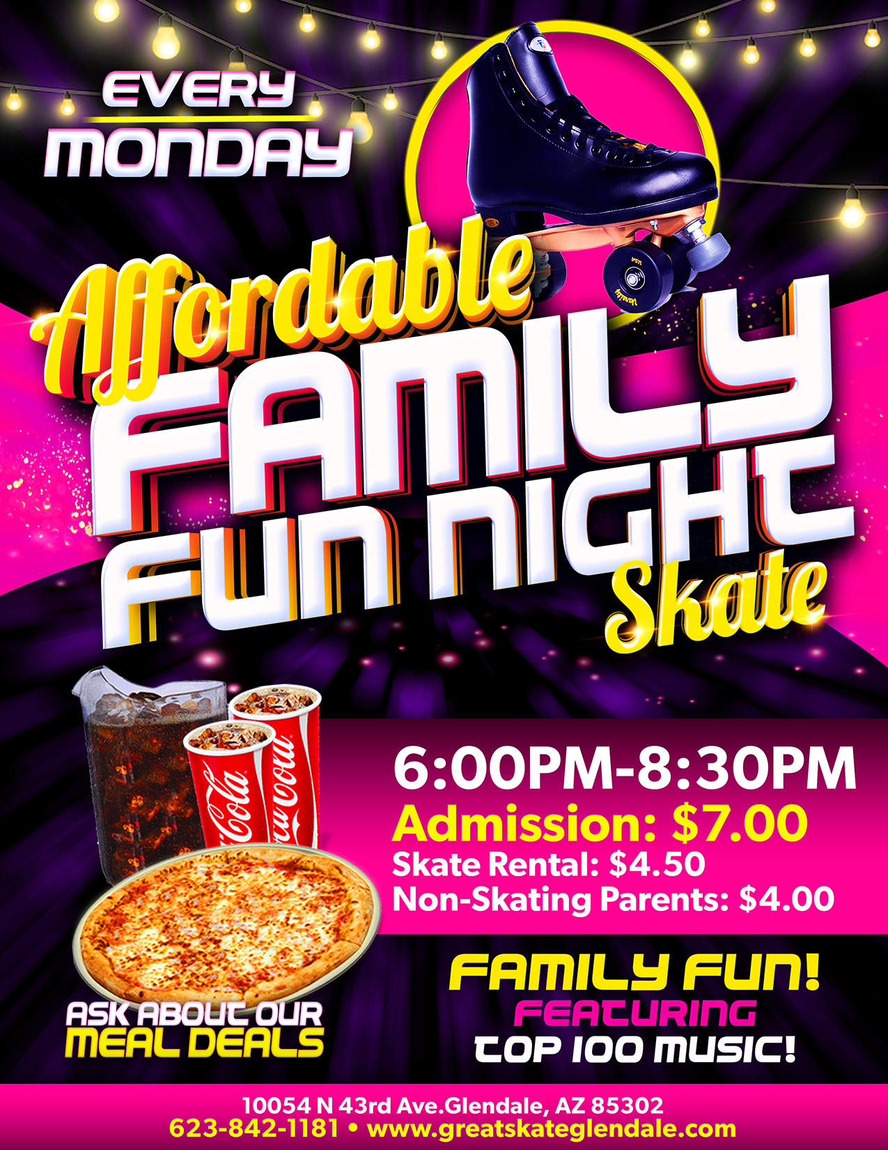 Every Wednesday Night 6:00pm - 8:30pm Admission: $16.00 includes skate rental, unlimited cheese pizza and a glow stick *No Passes/All Guests Pay Admission* Wrist Guards Required pick up a pair at the skate counter
