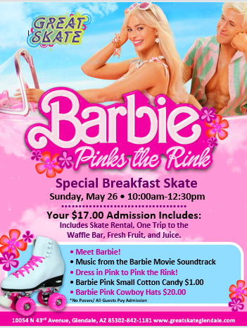 Sunday, May 26, 2024 10:00am -12:30pm Admission: $17.00 includes skate rental, One Trip to the Waffle Bar, Fruit and Juice *No Passes/All Guests Pay Admission Dress in PINK to PINK the Rink! Meet and Greet with Barbie.