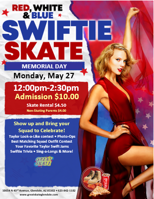 Happy Memorial Day Red, White & Blue Swiftie Skate Monday, May 27 12:00pm - 2:30pm Admission: $10.00 Skate Rental: $4.50 Non-Skating Parents: $4.50 Taylor Swift Music All Session Long Dress in your best ERA - Look - a- like contest Trivia Visit our Swifty Shop