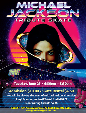 Summer Music Mash Up – Michael Jackson Skate Jun 25 Summer Music Mash Up – Michael Jackson Skate 6:30 pm - 8:30 pm