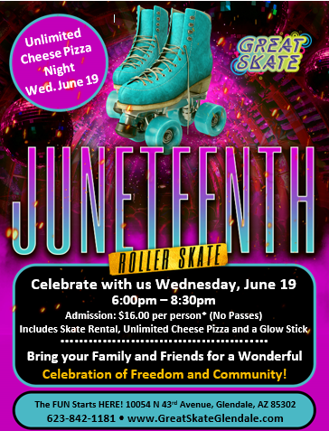 Juneteenth – All You Can Eat Cheese Pizza Skate Jun 19 Juneteenth – All You Can Eat Cheese Pizza Skate 6:00 pm - 8:30 pm