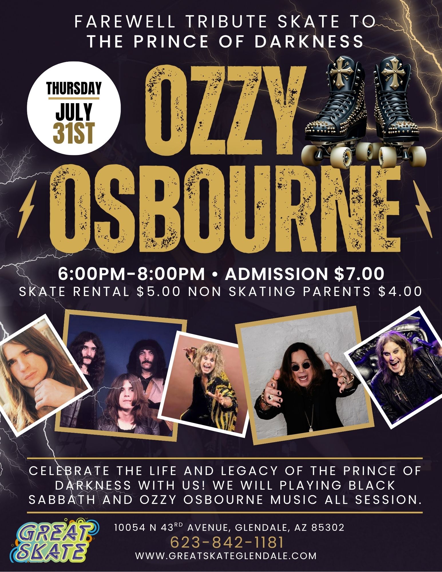 Farewell Tribute Skate: Ozzy Osbourne 1/2 Price Skate Edition Jul 31  Farewell Tribute Skate: Ozzy Osbourne 1/2 Price Skate Edition 6:00 pm - 8:00 pm